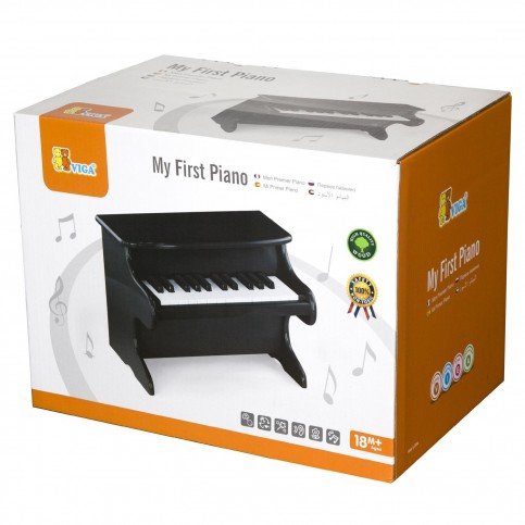 My First Piano Beautifully finished wooden piano in classic black. Cultivate children’s interests in melody and music, exercise children’s finger flexibility, practice hand and eye coordination. Includes a small music book teaching you how to play 8 songs including Twinkle Twinkle Little Star and Little Red Riding Hood! Product Information * Size: 400 x 300 x 255 mm * Recommended age: 18 months + Safety All Viga toys are made with non-toxic paints & inks and comply with EN71 & ASTM toy standards.