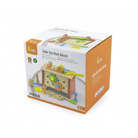 Table Top Workbench All the tools can be placed inside. All of hammering, nailing and screwing things together make for a lot of fun. A workbench to train motor skills is a dream come true for little craftsmen. Product Information * Size: 225 x 190 x 150 mm * Recommended age: 3 years + Safety All Viga toys are made with non-toxic paints & inks and comply with EN71 & ASTM toy standards.