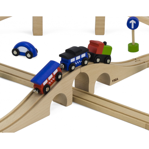 All Aboard! A perfect 49-piece starter set that can be built in to an assortment of different track formations for hours of fun. Compatible with other well-known brands of train set. Set includes 2 x people 2 x house 2 x tree 3 x sign 3 x car 2 x trains 4 x carriages 2 x bridges 2 x track switch plus some straights and curves A world of open ended play with trains, trees, figures, houses and cars. Includes straights, curves, switching track and bridges. Product Information: * Size: 415 x 285 x 75 mm * Recommended age: 3 years + Safety: All Viga toys are made with non-toxic paints & inks and comply with EN71 & ASTM toy standards.
