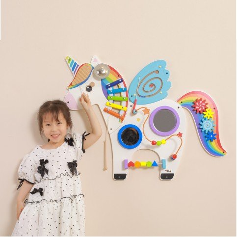 Colourful Unicorn Wall Toy This beautifully designed unicorn wall toy includes popular features such as turning gears, wire beads, xylophone, concave and convex mirror, gong, etc. The eyes of the unicorn could be rotated to show different expressions, encouraging emotional and cognitive development. Divided into 4 parts for easy transport and installment. Allows children to play together and learn about basic concept of colour, shapes, sounds, and mirror. Perfect addition to early learning environments and childcare centers.